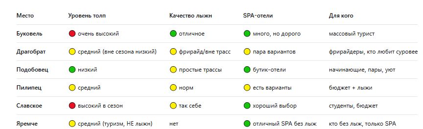 Буковель удобен тем, что позволяет не выбирать между активностью и восстановлением. Утром вы катаетесь, днем делаете паузу или идете на полуденный абонемент, а вечером уходите в воду, бани, массаж или просто в хороший теплый отель. Именно эта предсказуемость и делает его лучшей базой для тех, кто хочет не героизма, а комфортного зимнего отпуска с горами.
